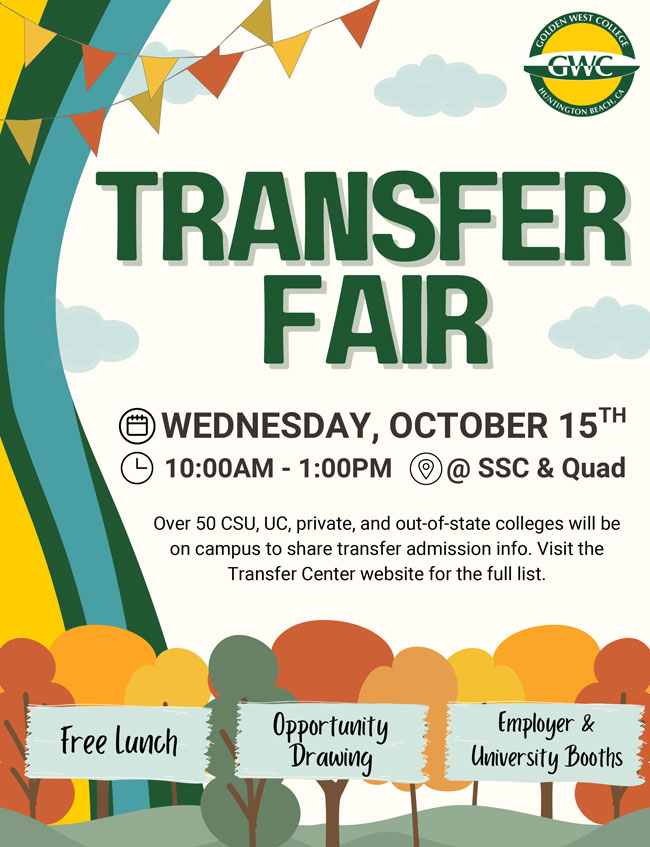 Over 50 CSU, UC, private, and out-of-state colleges will be on campus to share transfer admission info.